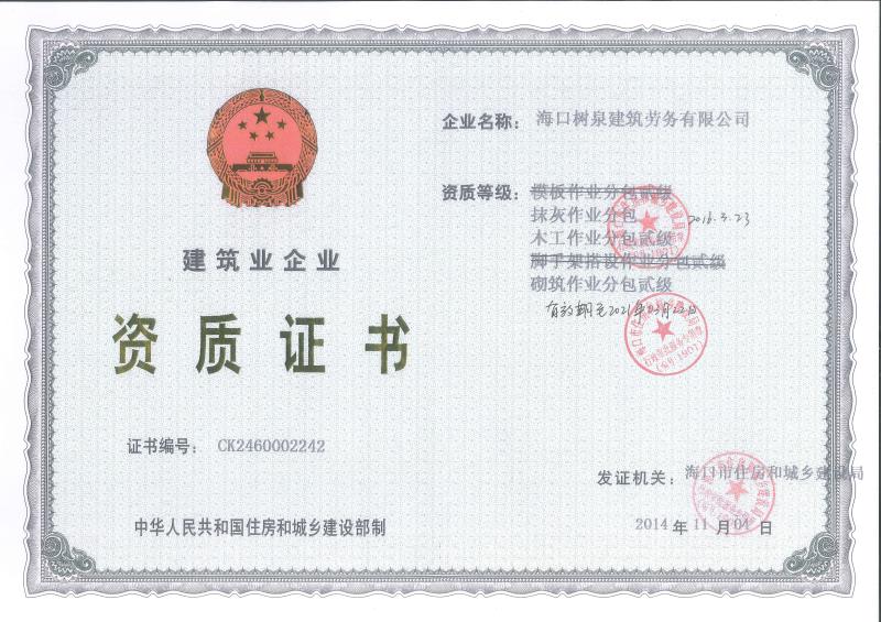 海口樹泉建筑勞務(wù)有限公司成立于2011年,公司位于海口,其前身是一家專業(yè)建筑施工隊(duì),自2004年即開始在海南從事建筑勞務(wù)施工。自成立至今,公司已經(jīng)擁有一支科學(xué)管理、質(zhì)量過硬、能打硬仗,搶工期的專業(yè)隊(duì)伍。能獨(dú)立承擔(dān)大中型工業(yè)與民用建筑 、室內(nèi)外裝修、各類機(jī)電設(shè)備安裝工程。代表工程有海口濱海華庭、三亞時(shí)代海岸T01/02/04/05棟高層、合肥東海花園二期、陵水富力灣B區(qū)高層、三亞金中海(酒店)、瓊海大印經(jīng)典花園、海口環(huán)球海景大酒店(四星級(jí)酒店,在建中)、陵水珍珠大廈(五星酒店)、海口萬達(dá)廣場、美蘭機(jī)場二期。